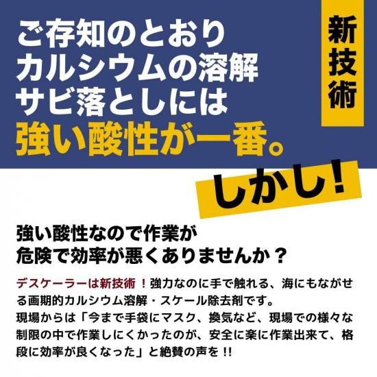 タンパク質への影響を極力抑へ、手で触っても大丈夫なのに驚異的な早さでカルシウムスケール溶かせる画期的スケール除去剤【インパクトデスケーラー】です。